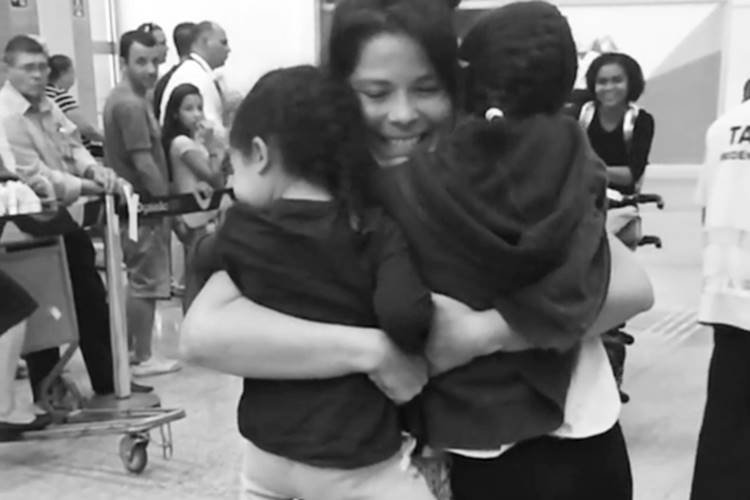 No aeroporto, a atriz mostrou o reencontro com as filhas Alicia e Lara, que passaram três semanas nos Estados Unidos na casa do pai, o jogador de basquete Leandrinho.