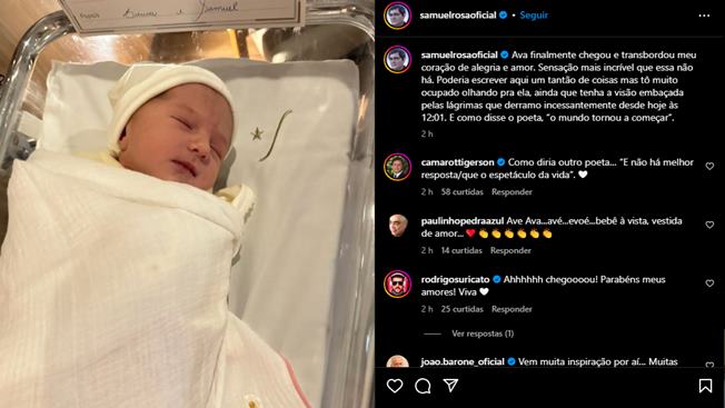 O cantor, compositor e guitarrista Samuel Rosa, 57 anos, compartilhou com seus admiradores uma notícia para lá de especial. Na noite da última quarta-feira, 20 de março, o artista mostrou a chegada da pequena Ava e emocionou.