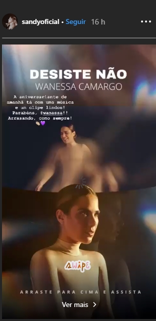 Na última sexta-feira (27), Sandy usou seu Instagram para divulgar o mais novo sucesso da filha do sertanejo Zezé Di Camargo, a cantora Wanessa lançou uma novo trabalho, a música, “Desiste Não”. A artista ainda aproveitou a ocasião para dar os parabéns a Wanessa.