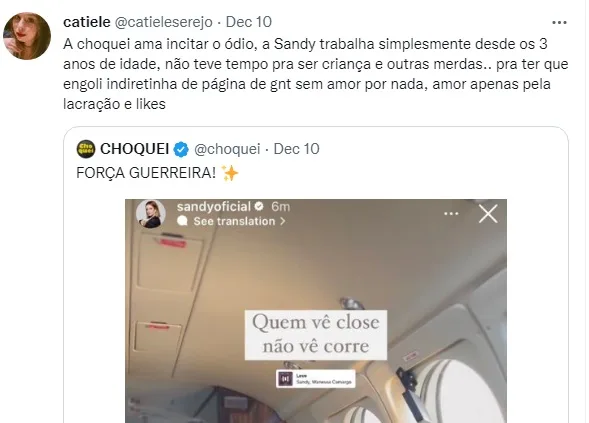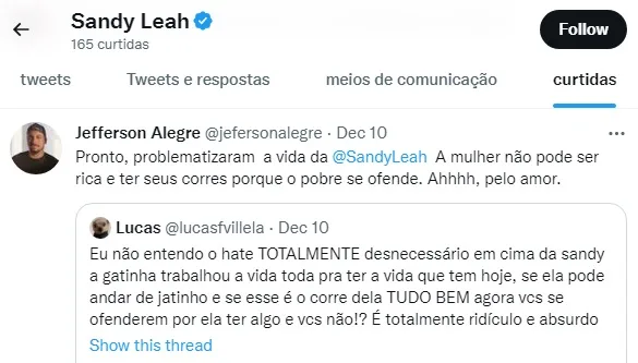 Em um dos tuítes curtidos pela artista, o usuário do Twitter diz: ”Pronto, problematizaram a vida da@SandyLeah. A mulher não pode ser rica e ter seus corres porque o pobre se ofende. Ahhhh, pelo amor”, disse. Em outro, ela critica a página por ”incitar ódio” contra ela.