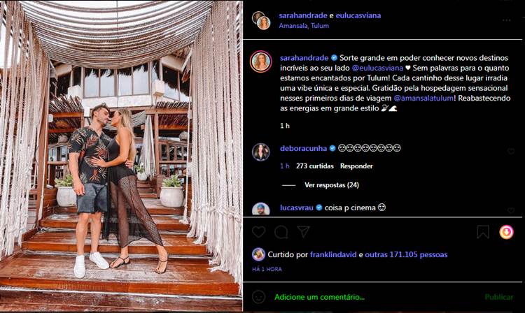 Na legenda, ela comemorou. “Sorte grande em poder conhecer novos destinos incríveis ao seu lado @eulucasviana ♥ Sem palavras para o quanto estamos encantados por Tulum! Cada cantinho desse lugar irradia uma vibe única e especial”, disse ela, que agradeceu a hospedagem. “Gratidão pela hospedagem sensacional nesses primeiros dias de viagem @amansalatulum! Reabastecendo as energias em grande estilo”, finalizou.