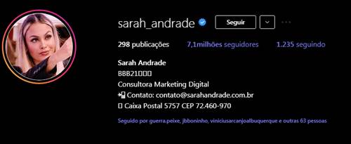 A participação de Sarah Andrade no ‘BBB21’ projetou a consultora de marketing e fez com que ela chegasse a acumular cerca de 9 milhões de seguidores no Instagram. Com os rolos dentro da casa, a loira acabou perdendo fãs, mas continuou em vantagem.