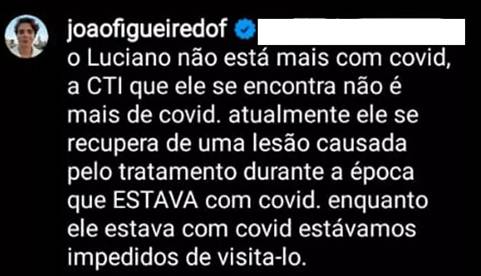 O genro de Xuxa deu alguns detalhes da saúde do sogro. “O Luciano não está mais com Covid. O CTI que ele se encontra não é mais Covid. Atualmente ele se recupera de uma lesão causada pelo tratamento durante a época que estava com Covid. Enquanto ele estava com Covid, estávamos impedidos de visitá-lo”, explicou ele.