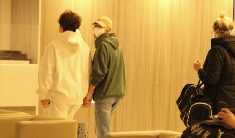 Nos cliques, a filha de Xuxa Meneghel aparece discreta usando um moletom verde, jeans e boné, enquanto o marido usa um look todo branco.