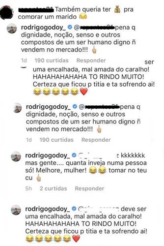 “Pena que dignidade, noção, senso e outros compostos de um ser humano não vendem no mercado“. E não parou por aí, Godoy perdeu a paciência e acabou batendo boca com outros seguidores. “Mas gente… quanta inveja numa pessoa só! Melhore mulher. Tomar no seu $%!”, e continuou, “Deve ser uma encalhada, mal amada do C$%¨&. Tô rindo muito. Certeza que ficou para titia e tá sofrendo aí”, disse.