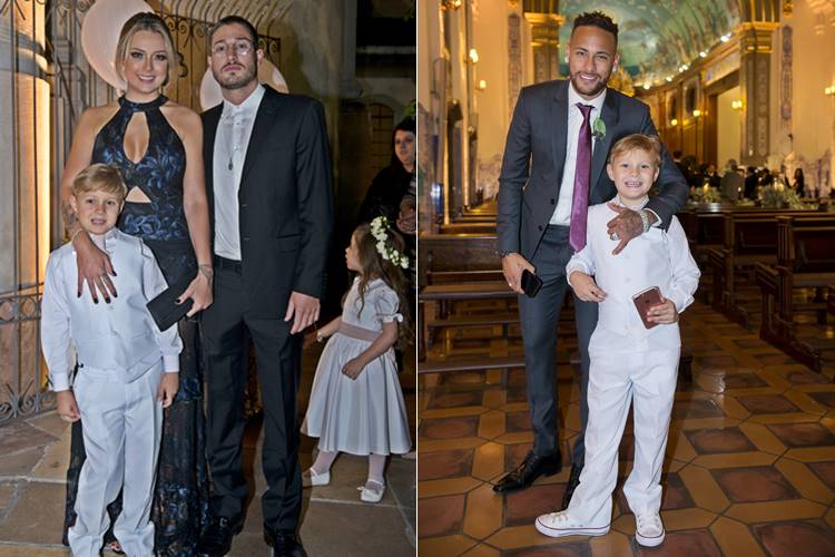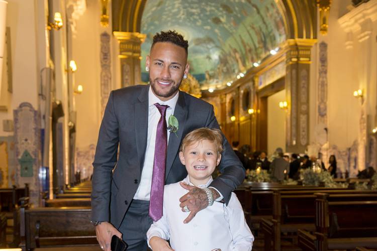 Amigo da noiva há muitos anos, sem a namorada Bruna Marquezine, o craque subiu ao altar ao lado da madrinha Dayane Fernandes e se emocionou durante a cerimônia ao lado do filho Davi Lucca, que entrou como pajem na cerimônia.