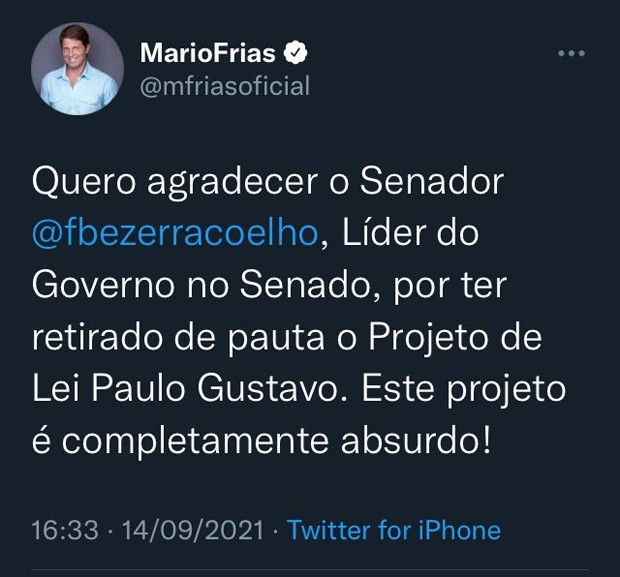 Dessa forma, Sergio Marone na noite desta quarta-feira, 15 de setembro, não poupou palavras para detonar a atitude do ex-ator. No Twitter, Mario Frias acabou sendo sarcástico em um agradecimento. “Quero agradecer o senador @fhezermcoelho [o senador do MDB Fernando Bezerra], líder do governo no Senado, por ter retirado de pauta o projeto de lei Paulo Gustavo. Este projeto é completamente absurdo!”, detonou Frias.