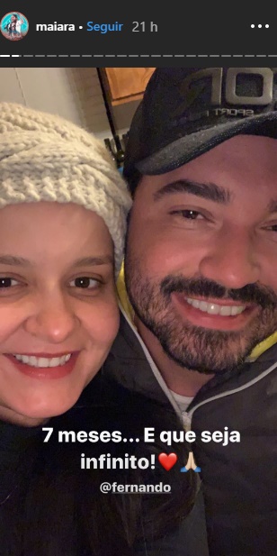 Neste sábado (7) a cantora Maiara usou as redes sociais seu Instagram para fazer uma declaração e comemorar sete meses ao lado de seu amor. No clique compartilhado ela surge coladinha ao lado do sertanejo Fernando seu namorado e com o coração derretido e transbordando de tanto amor ela escreveu na legenda: “E que seja infinito”, disse ela, apaixonada, na legenda. ( Foto abaixo).