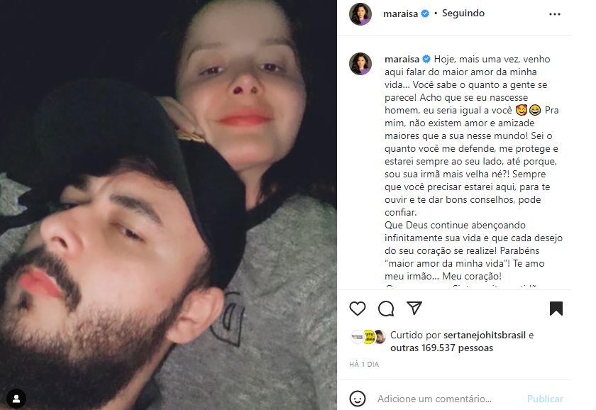 “Hoje, mais uma vez, venho aqui falar do maior amor da minha vida… Você sabe o quanto a gente se parece! Acho que se eu nascesse homem, eu seria igual a você. Pra mim, não existem amor e amizade maiores que a sua nesse mundo!”, iniciou a cantora Maraisa em sua postagem.