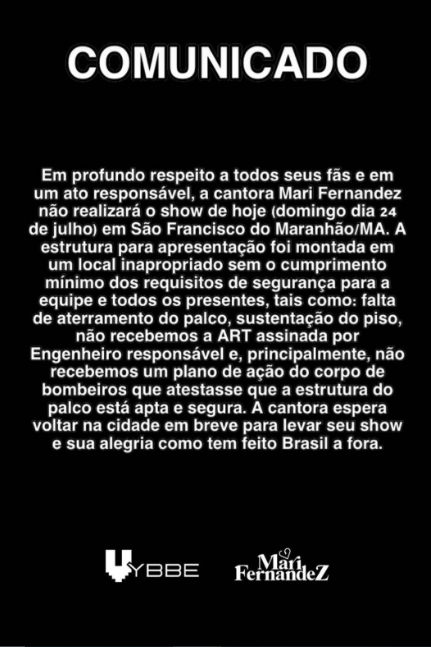 Dessa forma, em comunicado oficial, a equipe de Mari Fernandez explicou toda a situação, após a mesma gerar revolta nos fãs da cantora no estado. “A estrutura para apresentação foi montada em um local inapropriado sem o cumprimento mínimo dos requisitos de segurança para a equipe e todos os presentes”, iniciou a nota.