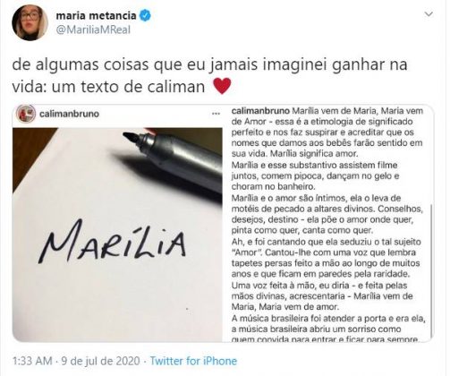 A sertaneja Marília Mendonça ganhou uma homenagem de uma das pessoas que mais admira. No Twitter, ela mostrou um texto que recebeu do artista Bruno Caliman.