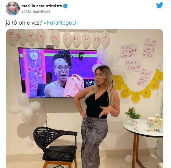 A sertaneja publicou um clique ao lado da televisão, e acompanhado do clique tiveram alguns balões com os dizeres “Fora Nego Di”. Cartazes colados nas paredes dizem: “Fã de sertanejo não vota”, ” Vem dar risada aqui fora, Nego Di”, “Tchau grupão” e “Traz a Jaque e a Lumena com você”. Até um vaso de plantas foi decorado com a frase “Planta faz isso”, dita pelo comediante dentro da casa. Na legenda, a cantora perguntou “Já tô on, e vocês?”.