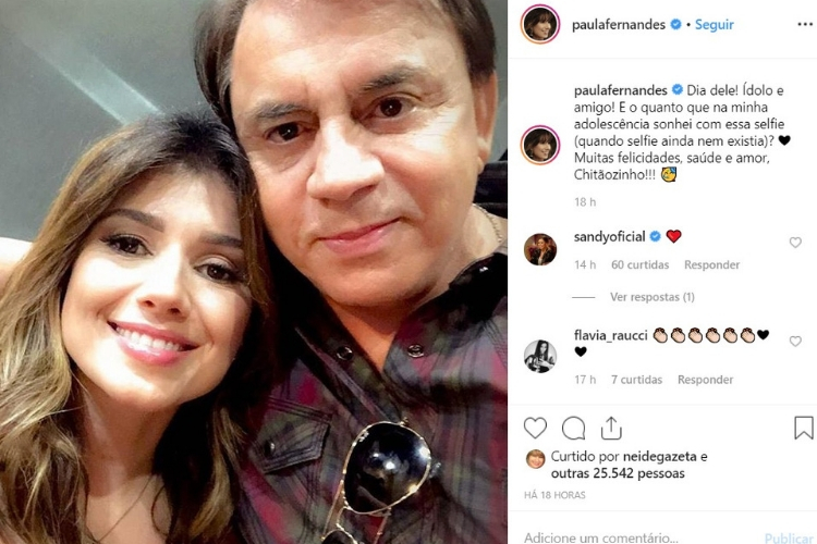 Em suas redes sociais, Paula Fernandes compartilhou uma foto em que aparece coladinha ao lado do sertanejo veterano. Na legenda, ela se derreteu pelo ídolo e revelou um sonho de infância: “Dia dele! Ídolo e amigo! E o quanto que na minha adolescência sonhei com essa selfie (quando selfie ainda nem existia)? Muitas felicidades, saúde e amor, Chitãozinho!”.