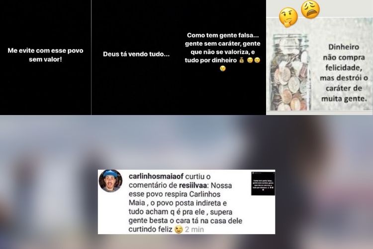 Visivelmente incomodada com a situação, a ‘coleguinha’ compartilhou uma indireta para alguma pessoa sem caráter: “Dinheiro não compra felicidade, mas destrói caráter de muita gente. Como tem gente falsa, gente sem caráter, gente que não se valoriza e faz tudo por dinheiro”.