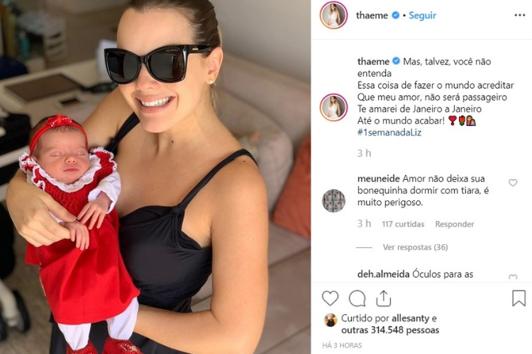 Em seu Instagram, Thaeme compartilhou uma foto com a bebê no colo e na legenda, se declarou a compartilhar uma estrofe da música: ‘De Janeiro a Janeiro’, de Nando Reis e Roberto Campos. “Mas, talvez, você não entenda essa coisa de fazer o mundo acreditar. Que meu amor, não será passageiro. Te amarei de Janeiro a Janeiro. Até o mundo acabar! 1 semana da Liz“, escreveu.