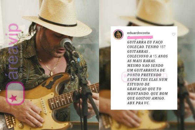 Na ocasião, o internauta questionou sobre quantos instrumentos ele possui prática e a quantidade que possui guardado. Sempre interativo, o artista revelou: “Guitarra eu faço coleção, tenho 187 guitarras. Coleciono há 15 anos as mais raras, mesmo não sendo um guitarrista de ponto, pretendo expor todas elas num estúdio de gravação que estou montando. Que bom que gostou, amigo. Abraço pra você!”, escreveu Eduardo.