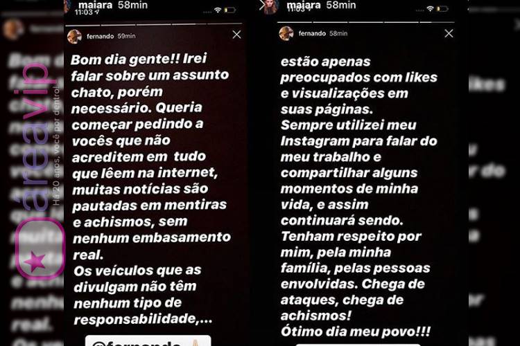 Nesta terça (21), Fernando Zor procurou se manifestar em sua conta oficial do Instagram e por meio do recurso Stories, envolvendo os motivos de seu término com Maiara e se defendeu dos “achismos” acerca do que teria ocasionado no fim do love.