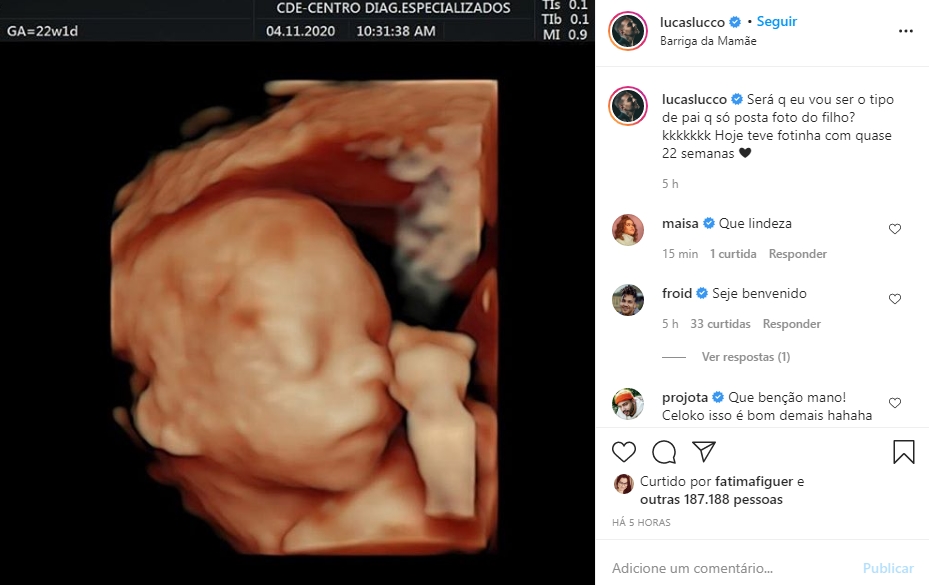 Aos seguidores, Lucas adiantou o que está por vir nos próximos meses. “Será que eu vou ser o tipo de pai que só posta foto do filho? (Risos) hoje teve fotinha com quase 22 semanas”, escreveu ele.