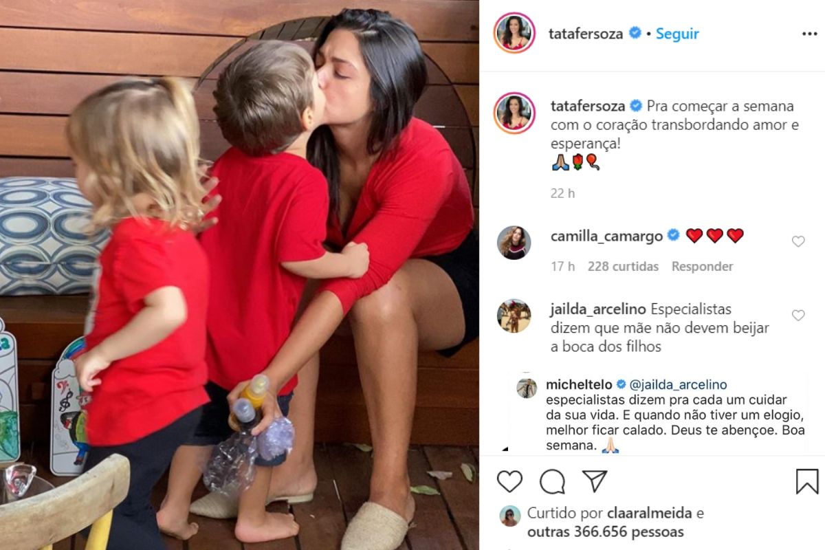 Nesta última segunda-feira, a sua esposa, Thaís Fersoza, compartilhou uma foto para lá de especial ao lado dos filhos do casal. Na imagem, a esposa do cantor sertanejo Michel Teló estava beijando o filho na boca.