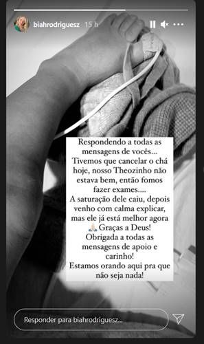“Respondendo a todas as mensagens de vocês. Tivemos que cancelar o chá hoje, nosso Theozinho não estava bem, então, fomos fazer exames. A saturação dele caiu, depois venho com calma explicar, mas ele já está melhor, agora. Graças a Deus! Obrigada a todas as mensagens de apoio e carinho. Estamos orando aqui para que não seja nada”, disse Biah.