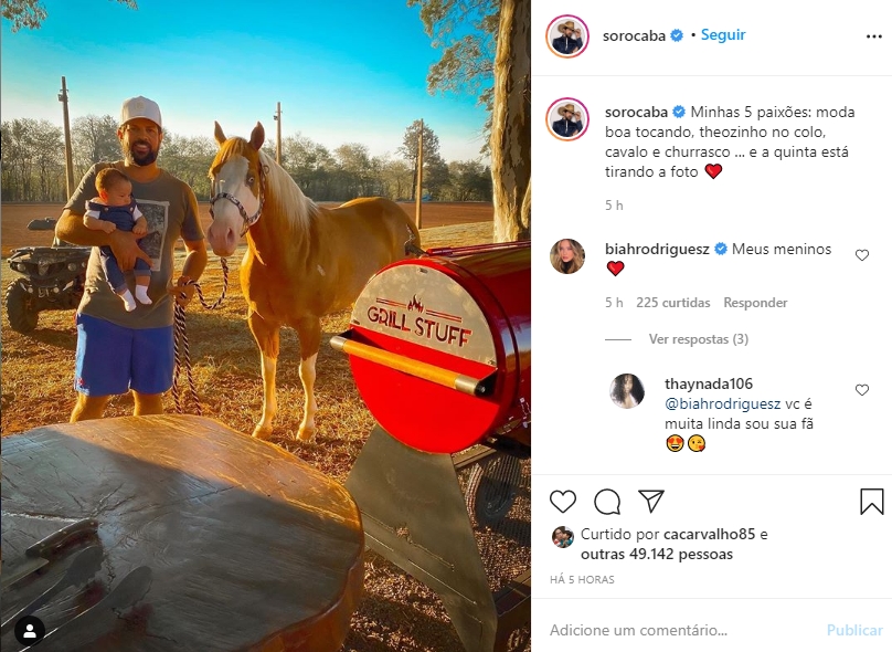 “Minhas 5 paixões: moda boa tocando, theozinho no colo, cavalo e churrasco … e a quinta está tirando a foto”, disse ele se referindo a esposa Biah Rodrigues com quem se casou em dezembro de 2019.