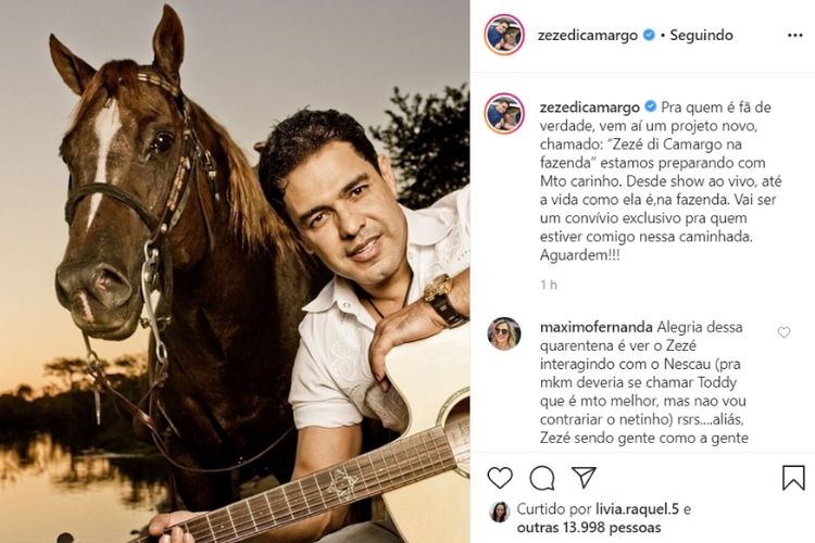 Na legenda da publicação, compartilhada no feed de notícias de seu perfil, ele deu todos os detalhes: “Pra quem é fã de verdade, vem aí um projeto novo, chamado: ‘Zezé di Camargo Na Fazenda’ estamos preparando com muito carinho. Desde show ao vivo, até a vida como ela é, na fazenda. Vai ser um convívio exclusivo pra quem estiver comigo nessa caminhada”, iniciou ele, que pediu aos seus seguidores: “Aguardem”, finalizou. Veja na imagem capturada pela equipe de mídias do Área VIP: