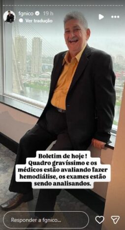 Através dos stories no Instagram, Francisco Garcia revelou a piora no estado de saúde do pai. “Boletim de hoje! Quadro gravíssimo e os médicos estão avaliando fazer hemodiálise, os exames estão sendo analisados“, contou o influenciador.