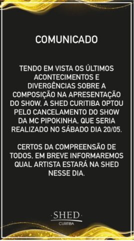 ”Tendo em vista os últimos acontecimentos e divergências sobre a composição na apresentação do show, a Shed Curitiba optou pelo cancelamento do show da MC Pipokinha, que seria realizado no sábado dia 20/05. Certos da compreensão de todos, em breve informaremos qual artista estará na Shed nesse dia”, informa a nota.