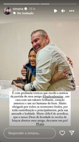 Por meio dos stories no Instagram, Simaria compartilhou um clique onde surge abraçada com Hudson, escrevendo na legenda: “É com profunda tristeza que recebi a notícia da partida do meu amigo. Um cara com um talento brilhante, coração amoroso e um ser humano do bem“, escreveu ela.