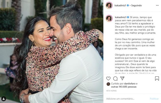 Através das redes sociais, Kaká Diniz compartilhou uma foto abraçado com a amada e na legenda felicitou por mais um. O empresário falou sobre a alegria de poder dividir mais um ano ao lado da amada e comemorou a linda família que eles construíram juntos.
