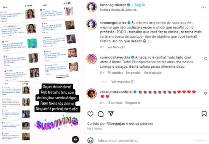 “Só para deixar claro!! Todo trabalho feito com dedicação e carinho é digno. Fazer faxina não diminui ninguém! E pedir ajuda também não“, postou Simone no Instagram. “Eu não me arrependo de nada que fiz, mesmo que não pudesse exercer o ofício que escolhi como profissão! Todo trabalho que você faz te ensina, te torna mais forte em busca de qualquer tipo de objetivo que você tenha!! Prefiro isso do que desistir“, acrescentou.