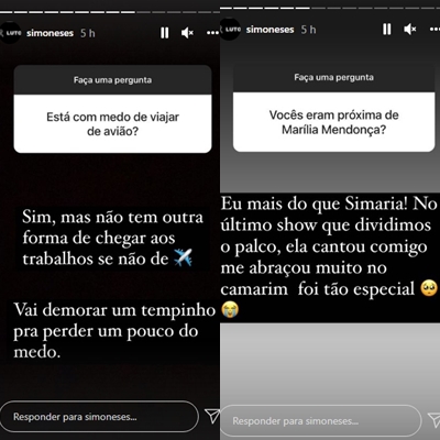 Questionada por um fã sobre próximas viagens, Simone ainda disse que está com medo de viajar de avião: “Sim, estou com medo de viajar de avião, mas não tem outra forma de chegar aos trabalhos se não for assim. Vai demorar um tempinho para perder um pouco do medo”, afirmou.