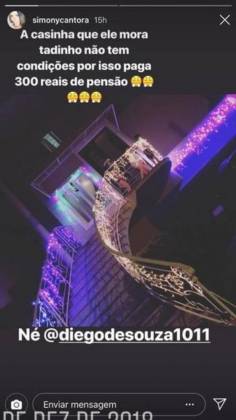 Se antes ele pagava 1.200 ao mês, depois do pedido de revisão, o valor caiu para apenas 300 reais. Em seu stories no Instagram, Simony escreveu: “A casinha que ele mora, tadinho. Não tem condições, por isso paga R$ 300 de pensão”, disse ela, exibindo uma foto da mansão do ex.