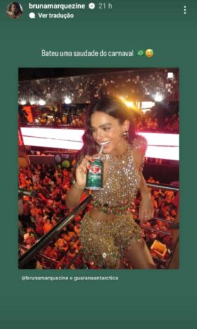“Bateu uma saudade do Carnaval”, escreveu a atriz em sua publicação. Na foto (acima), Bruna aparece vestindo um conjunto brilhante e cheio de movimento. O brilho também aparece no canudo e na lata do refrigerante.