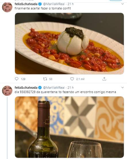 “Arrumei meu cabelo, fiz a unha. Comprei tomate cereja, pão italiano… vou fazer burrata com tomate confit. Abrir um vinho. Hoje tenho um date. comigo mesma”, escreveu ela na rede social.