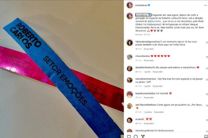 “Chegando em casa agora, depois de curtir a gravação do especial de Roberto Carlos/50 Anos, sob a direção sensível de Boninho, que irá ao ar em dezembro, pela Rede Globo!”, começou Sonia Abrão, diretamente do feed de seu Instagram, ao publicar uma foto da pulseira vip que usou no evento.