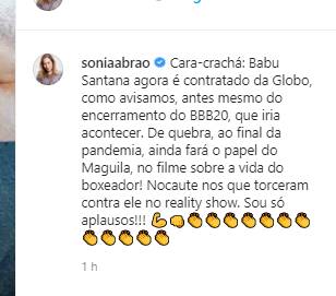 “Cara-crachá: Babu Santana agora é contratado da Globo, como avisamos, antes mesmo do encerramento do BBB20, que iria acontecer. De quebra, ao final da pandemia, ainda fará o papel do Maguila, no filme sobre a vida do boxeador! Nocaute nos que torceram contra ele no reality show. Sou só aplausos!!!”, escreveu ela.