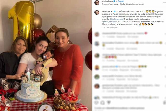 Sonia Abrão compartilhou com seus seguidores nesta terça-feira (21) uma imagem em que aparece ao lado da família comemorando o primeiro mêsversário do neto, Filippo.