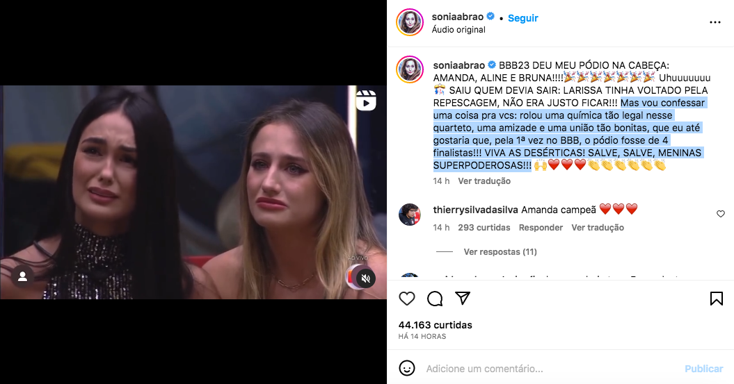 Assim, através de seu perfil no Instagram, a contratada da RedeTV! compartilhou um trecho do discurso feito por Tadeu Schmidt. “BBB23 DEU MEU PÓDIO NA CABEÇA: AMANDA, ALINE E BRUNA!!!! Uhuuuuuuu. SAIU QUEM DEVIA SAIR: LARISSA TINHA VOLTADO PELA REPESCAGEM, NÃO ERA JUSTO FICAR!!!”, iniciou a jornalista.