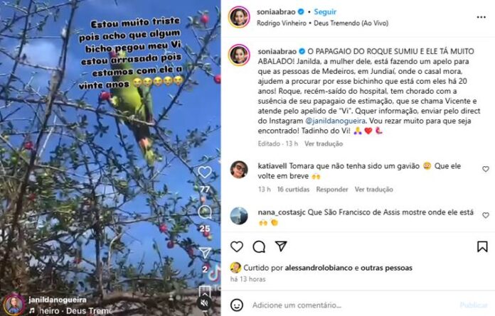 Em seguida, Sonia frisou: “Roque, recém-saído do hospital, tem chorado com a ausência de seu papagaio de estimação, que se chama Vicente e atende pelo apelido de “Vi”. Qualquer informação, enviar pelo direct do Instagram @janildanogueira. Vou rezar muito para que seja encontrado! Tadinho do Vi! 🙏❤️🦜“, acrescentou a comunicadora.