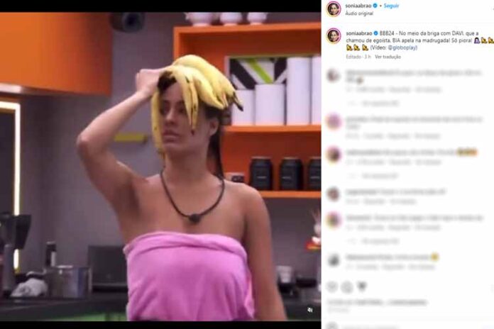 Sonia Abrão compartilhou um vídeo em que Bia aparece com uma casca de banana na cabeça durante a madrugada e a criticou, voltando a afirmar que Davi estava certo em seu argumento durante a dinâmica.