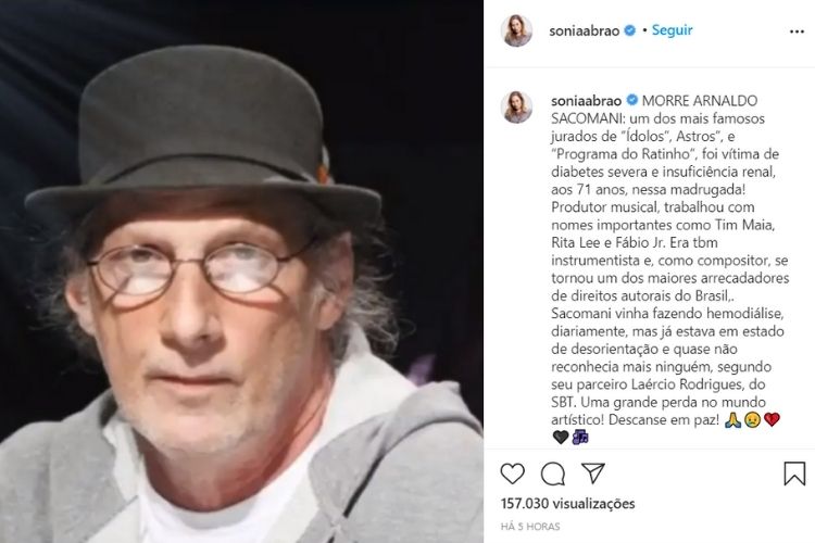 A apresentadora Sonia Abrão também foi uma das personalidades que lamentaram a morte do produtor musical Arnaldo Saccomani. Através de seu perfil oficial nas redes sociais, a artista compartilhou um texto, demonstrando toda a admiração que tem por ele.
