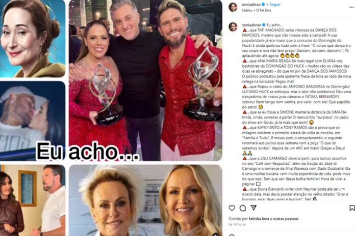Falando ainda sobre a grande final, Sonia diz que o ator Antonio Banderas não conseguiu chamar tanta atenção como deveria. “Que flopou o vídeo do ANTONIO BANDERAS no Domingão! LUCIANO HUCK se esforçou, mas o ator não colaborou! Deu uma dançadinha de costas para as câmeras e FÁTIMA BERNARDES sobrou! Nem tango nem samba, de verdade, com ele! Que papelão do astro!”, destacou.