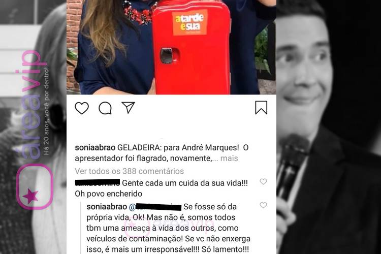 Após o flagra, a jornalista Sonia Abrão utilizou a conta oficial do Instagram e posou com um click com a famosa “geladeira” do seu programa vespertino. Em desabafo, na legenda da publicação ela detonou a atitude irresponsável de Marques. “GELADEIRA: para André Marques! O apresentador foi flagrado, novamente, em seu restaurante, sem máscara e sem distanciamento social, abraçando amigos e fãs, em plena pandemia. Agora nem adianta vir com desculpinha furada, como da primeira vez! Não cola mais! Irresponsabilidade e ponto final!”, disparou.
