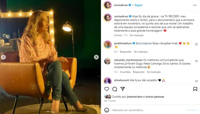 “Hoje foi dia de gravar, na TV RECORD, meu depoimento sobre o GUGU, para o documentário que a emissora exibirá em novembro, no quinto ano de sua morte! Um trabalho de uma equipe competente e sensível que vem se dedicando totalmente a essa grande homenagem! ❤️“, publicou ela.