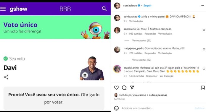 Nos comentários, muitos internautas apontaram Matteus como merecedor: “Sai fora ! É Matteus campeão“, comentou uma. “Sou muitoooo mais o Matteus!!!!“, comentou outro. “Eu também. Votei para o Mateus ganhar“, escreveu uma terceira. “Davi merece? Merece. Mas, o Matteus merece muito mais“, comentou outro internauta, indo contra a opinião da comunicadora.