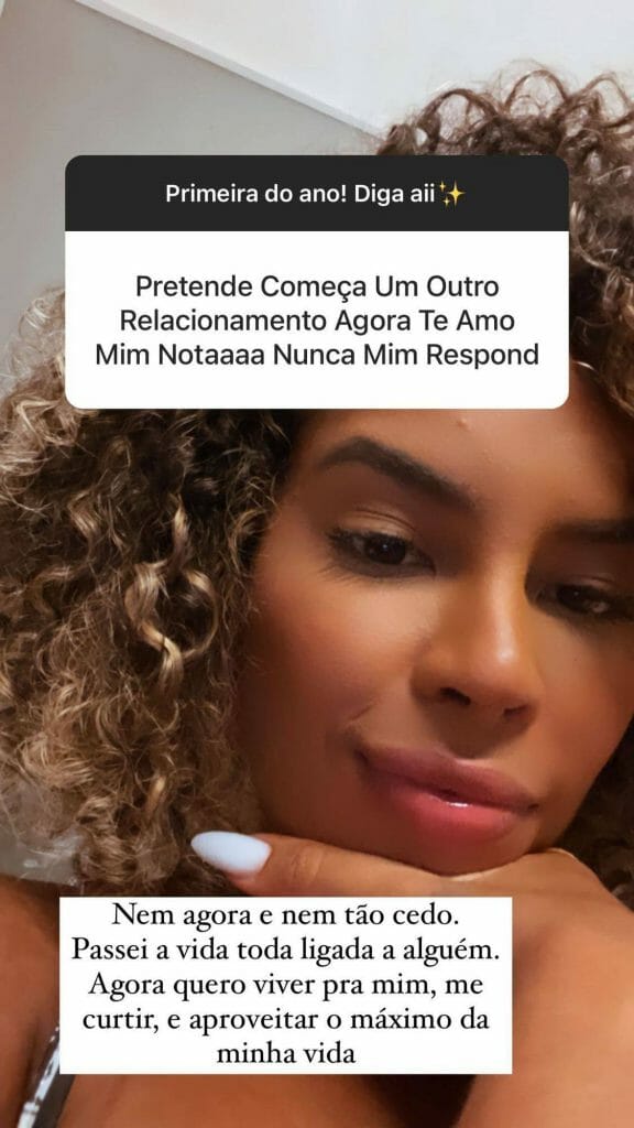 “Nem agora e nem tão cedo. Passei a vida toda ligada a alguém. Agora quero viver pra mim, me curtir e aproveitar o máximo da minha vida”, escreveu a influenciadora. Logo após, a artista prosseguiu interagindo com os fãs e afirmou que se apega fácil as pessoas.