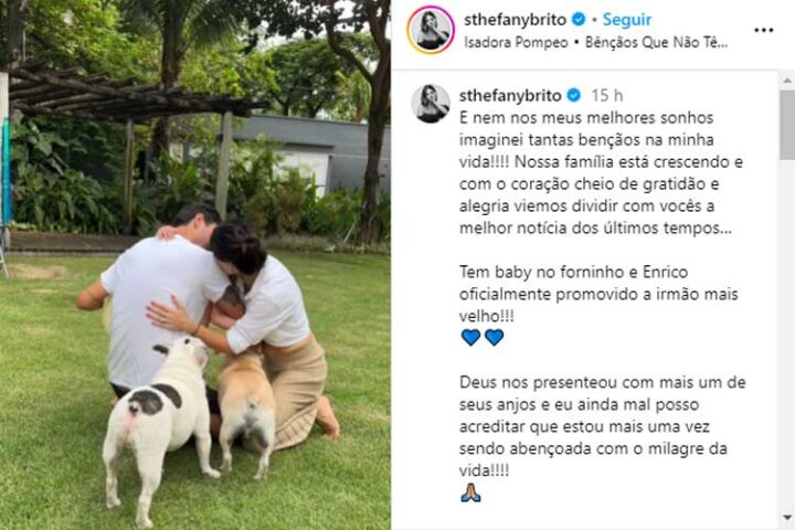 “E nem nos meus melhores sonhos imaginei tantas bênçãos na minha vida!!!! Nossa família está crescendo e com o coração cheio de gratidão e alegria viemos dividir com vocês a melhor notícia dos últimos tempos“, disse ela na publicação.