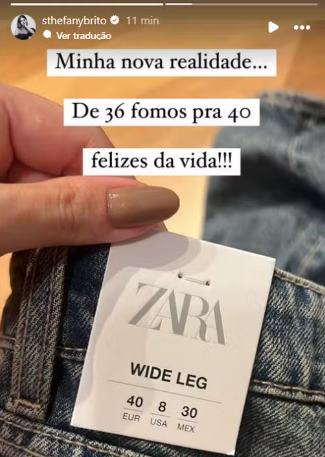 Através de sua conta oficial do Instagram Stories, a mais nova mamãe do pedaço mostrou aos seus admiradores que o tamanho de suas roupas mudaram. Antes vestindo 36, agora a famosa veste 40. Na legenda da publicação, a atriz escreveu o seguinte: ”Minha nova realidade… De 36 fomos pra 40! Felizes da vida!”, apontou.