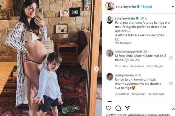“Parei pra tirar uma foto da barriga e o meu fotógrafo preferido dessa vida apareceu… A última foto é a melhor de todas!”, escreveu a atriz na legenda. “Que foto linda. Maternidade real de dois filhos”, destacou uma seguidora. “Enrico tá um homenzinho. Tá enorme”, disse outra.